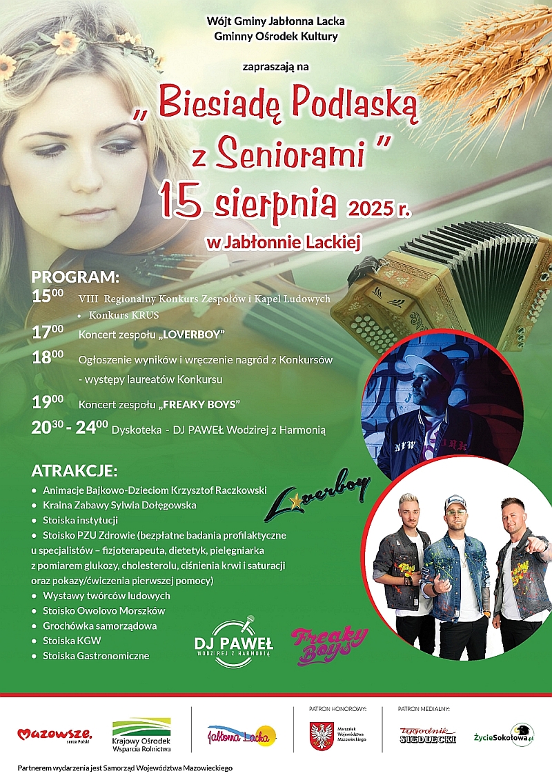 Za nami niezapomniany dzień pełen muzyki, tradycji, smaków i dobrej zabawy! Tegoroczna "Biesiada Podlaska z Seniorami" po raz kolejny zgromadziła mieszkańców i gości, którzy razem stworzyli wyjątkową atmosferę lokalnego święta. Wydarzenie rozpoczął VIII Regionalny Konkurs Zespołów i Kapel Ludowych, który dostarczył wielu wzruszeń i radości, przypominając, jak piękne są nasze regionalne tradycje. W konkursie przyznano trzy nagrody główne oraz dwa wyróżnienia: I miejsce - Zespół Ludowy Jabłoniacy, II miejsce Zespół Ludowy Marysieńki, III miejsce Zespół Ludowy Sąsiadeczki. Wyróżnienia: I. Zespół Śpiewaczy Chodów, II. Zespół Ludowy Zakrze Śpiewa. Nagrody uczestnikom wręczali: Członek Zarządu Województwa Mazowieckiego Janina Ewa Orzełowska, Wójt Gminy Jabłonna Lacka Wiesław Michalczuk oraz Przewodniczący Rady Gminy Stanisław Strzała. Podczas wydarzenia KRUS - Placówka Terenowa w Sokołowie Podlaskim zorganizował konkurs wiedzy o bezpieczeństwie i higienie pracy w rolnictwie pod hasłem „Pracuj bezpiecznie”. Nagrody, ufundowane przez KRUS oraz Gminę Jabłonna Lacka, wręczyli Kierownik KRUS Tadeusz Hardej oraz Wójt Gminy Jabłonna Lacka Wiesław Michalczuk. Dzieci korzystały z animacji, dmuchańców oraz specjalnych atrakcji przygotowanych z myślą o najmłodszych. W specjalnej strefie „Bezpiecznie na plaży z Mazowszem”, organizowanej przez Muzeum Sportu i Turystyki, odbywały się zawody sportowo-ratownicze, pokazy pierwszej pomocy, a także spotkania z wyjątkowym gościem – Dariuszem Kowalukiem - Złotym Medalistą Olimpijskim z Tokio, który z ogromną życzliwością spotykał się z mieszkańcami i opowiadał o swojej karierze sportowej. 53 Batalion Lekkiej Piechoty przygotował wojskowe atrakcje – prezentację pojazdów, sprzętu wojskowego oraz ścieżkę saperską dla dzieci, która łączyła edukację z przygodą. Na smakoszy czekały: grochówka samorządowa, przysmaki przygotowane przez Koła Gospodyń Wiejskich, zdrowe produkty od Owolovo. Nie zabrakło też atrakcji dla całych rodzin – Wojewódzki Ośrodek Ruchu Drogowego w Siedlcach przygotował tor rowerowy, swoje stoiska zaprezentowali twórcy ludowi i lokalne instytucje, a dzięki obecności PZU Zdrowie można było skorzystać z bezpłatnych badań profilaktycznych. Wieczorna część wydarzenia miała zdecydowanie bardziej rozrywkowy charakter. Na scenie zagościły zespoły LOVERBOY i FREAKY BOYS, a całość zakończyła się taneczną dyskoteką z DJ-em, która przyciągnęła tłumy uczestników. Serdeczne podziękowania kierujemy do wszystkich, którzy przyczynili się do sukcesu wydarzenia: Samorządowi Województwa Mazowieckiego – za finansowe wsparcie, partnerstwo przy organizacji Biesiady, oraz objęcie wydarzenia patronatem, Pani Janinie Ewie Orzełowskiej – Członkini Zarządu Województwa Mazowieckiego za zaszczycenie nas swoją obecnością, życzliwe słowa skierowane do mieszkańców oraz nieustanne wspieranie inicjatyw na rzecz lokalnej społeczności, Krajowemu Ośrodkowi Wsparcia Rolnictwa (KOWR) za finansowe wsparcie oraz partnerstwo przy organizacji Biesiady, Panu Leszkowi Iwaniukowi – Zastępcy Dyrektora KOWR za obecność oraz zaangażowanie w promowanie inicjatyw lokalnych, Żołnierzom 53 Batalionu Lekkiej Piechoty – za obecność i wspaniałe wojskowe atrakcje, Kołom Gospodyń Wiejskich – za wyjątkowe smaki, serdeczność, i ciepłą atmosferę, Stoisku Owolovo – za promocję zdrowego stylu życia, Wszystkim sponsorom i partnerom – za wsparcie, zaufanie i zaangażowanie, Naszym gościom i mieszkańcom – za tak liczne przybycie i wspólne świętowanie! To był dzień pełen pozytywnych emocji, integracji i dumy z naszej lokalnej kultury. Dziękujemy, że byliście z nami i… do zobaczenia za rok! Partnerem wydarzenia był Samorząd Województwa Mazowieckiego oraz Krajowy Ośrodek Wsparcia Rolnictwa. Mazowsze serce Polski, Krajowy Ośrodek Wsparcia Rolnictwa, #KupujŚwiadomie